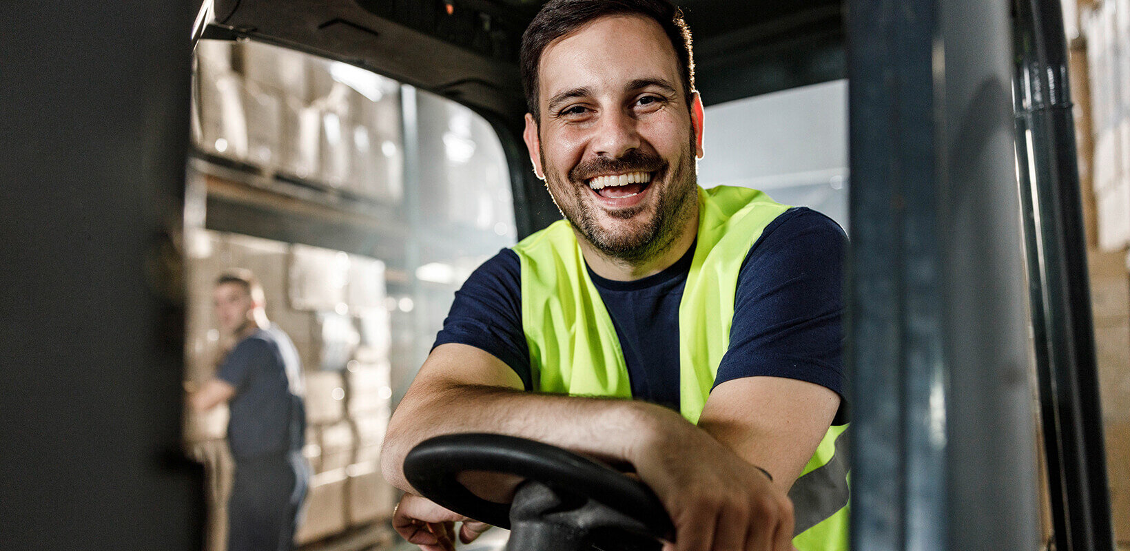 Lächelnder Mann mit Warnweste sitzt auf Gabelstapler in Lagerhalle.